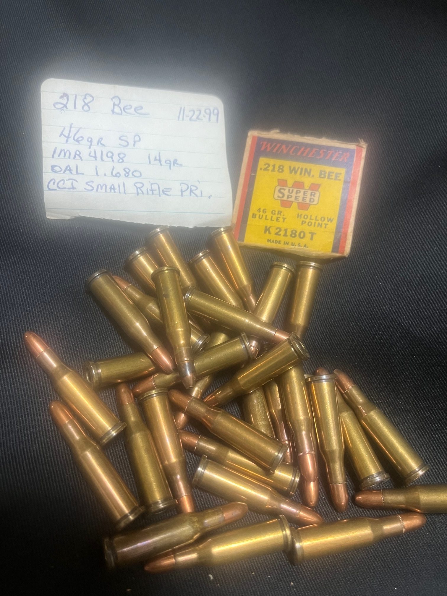 This is Reloaded Ammo that came from an Estate where the owner was a well known reloader in La. He was very maticulas and kept very good notes of his reloads. He used Winchester 46 gr HP, 14 gr IMR 4198, CCI Small Rifle Primers, with a OAL 1.680