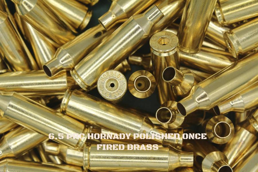 6.5 PRC Hornady polished once-fired brass, packaged in a lot of 50 cases. Each case has been fired once and subsequently processed for reloading use. The brass has been magnetically screened to remove ferrous materials and machine sorted to ensure consistent case dimensions and integrity before cleaning.